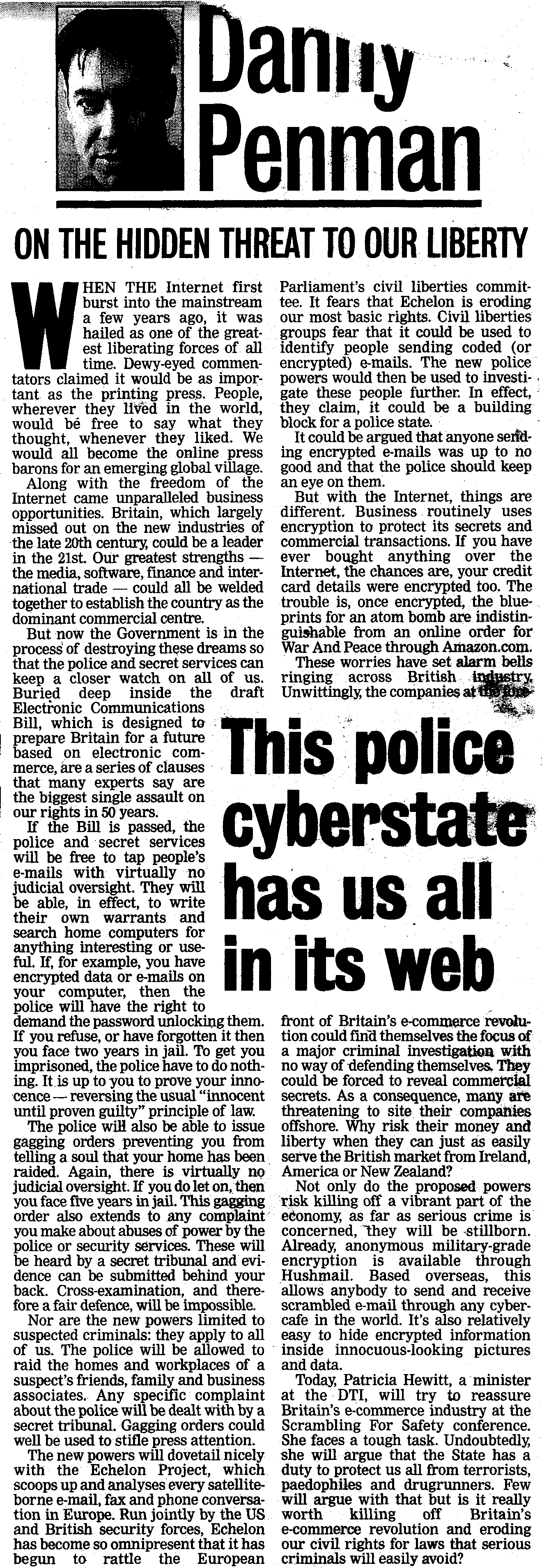 The connections between Home Office policy on interception and powers proposed in Part.III of the DTI's draft Electronic Communications Bill (see FIPR Press Release) will be explored, and well as the legal framework for establishing voluntary licensing of cryptography services, and recognition of digital signatures.